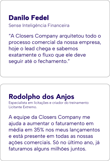 Já tive o privilégio de estruturar e liderar operações de vendas para grandes nomes como Conrado Adolpho, Peter Jordan, Rodolpho dos Anjos, Duda Vieira entre outros, além de atuar diretamente na estruturação de times comerciais para empresas que desejavam parar de depender do feeling e começar a vender com método.