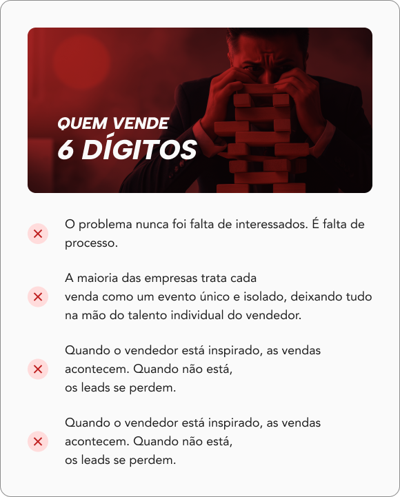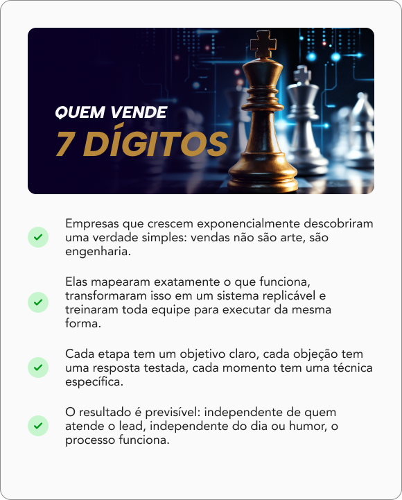 Precisa de scripts, protocolos e treinamentos validados por operações que já venderam múltiplos 8 dígitos.
